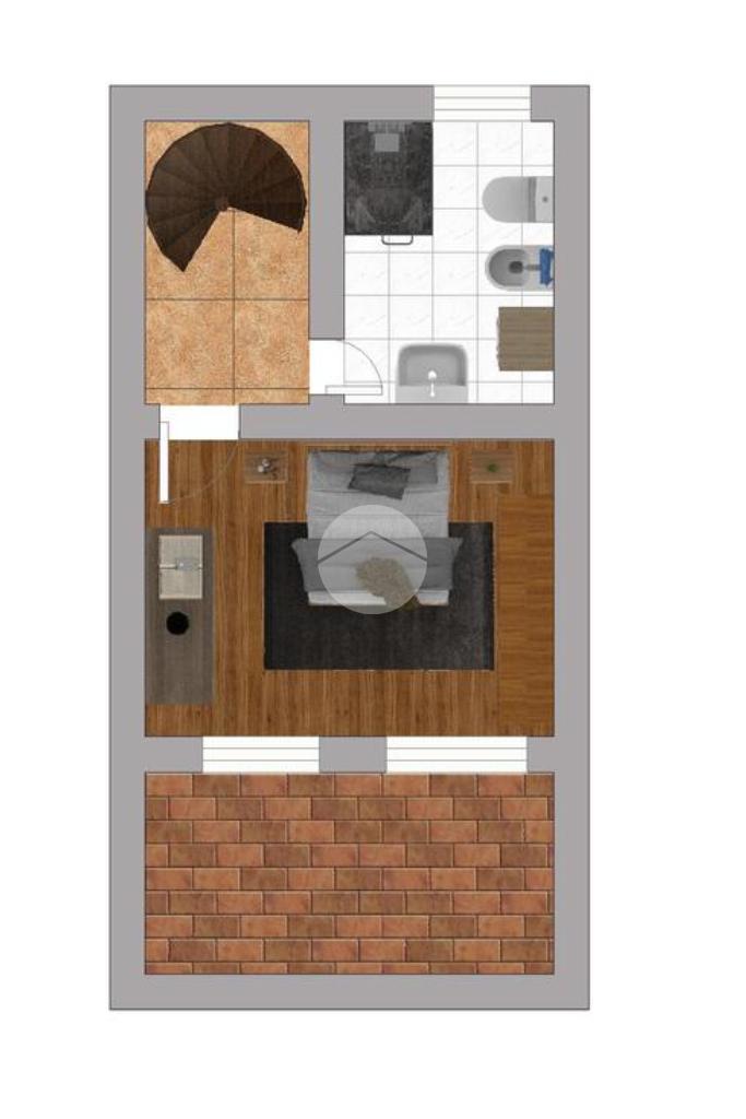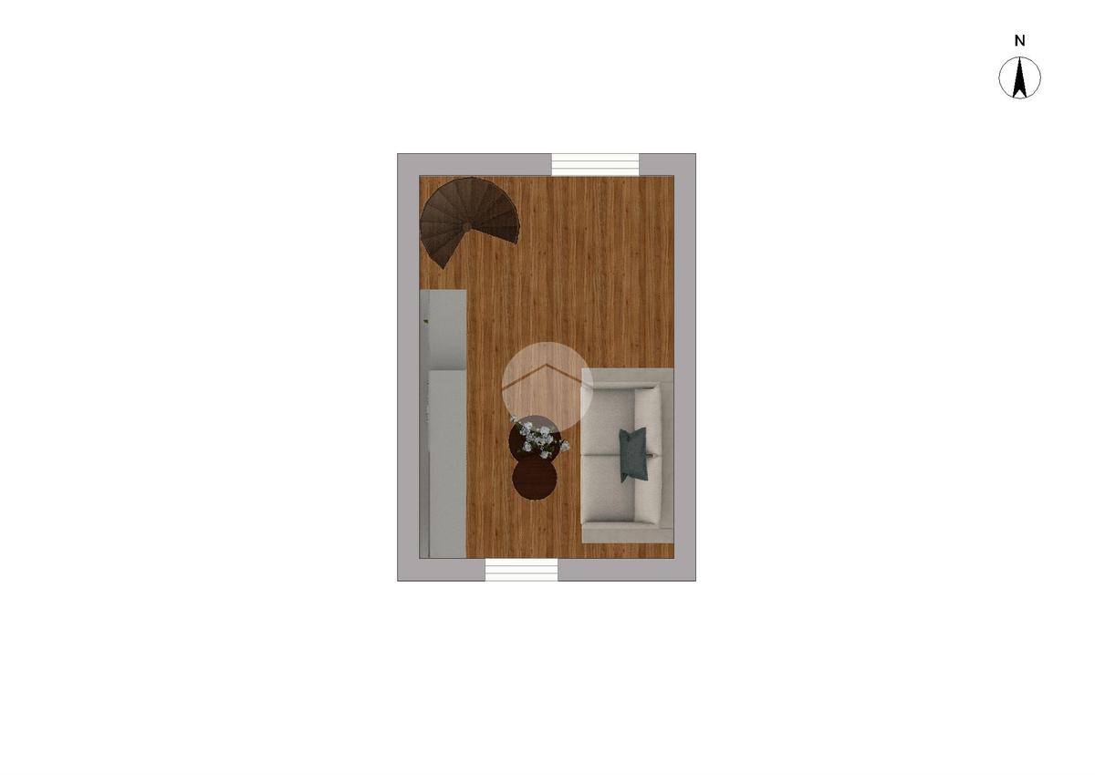Una scala a chiocciola collega il piano superiore, dove un disimpegno conduce alla camera matrimoniale con accesso al balcone esposto a nord e al bagno con doccia, dotato di porta finestra che permette un ulteriore collegamento con l’area esterna sul lato sud, garantendo luminosità e aerazione naturale.