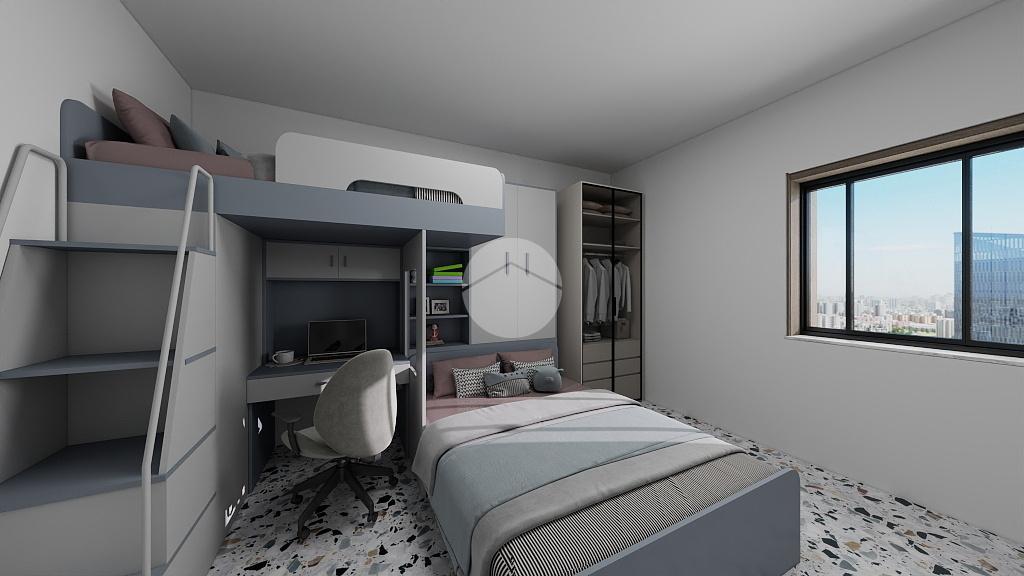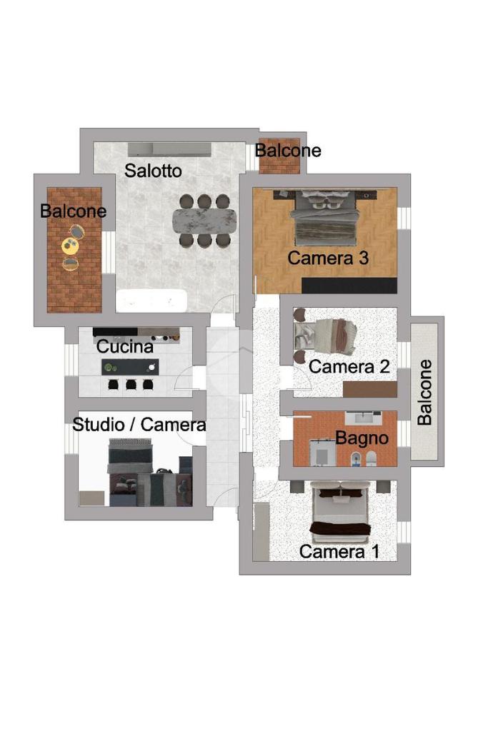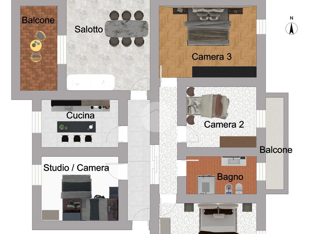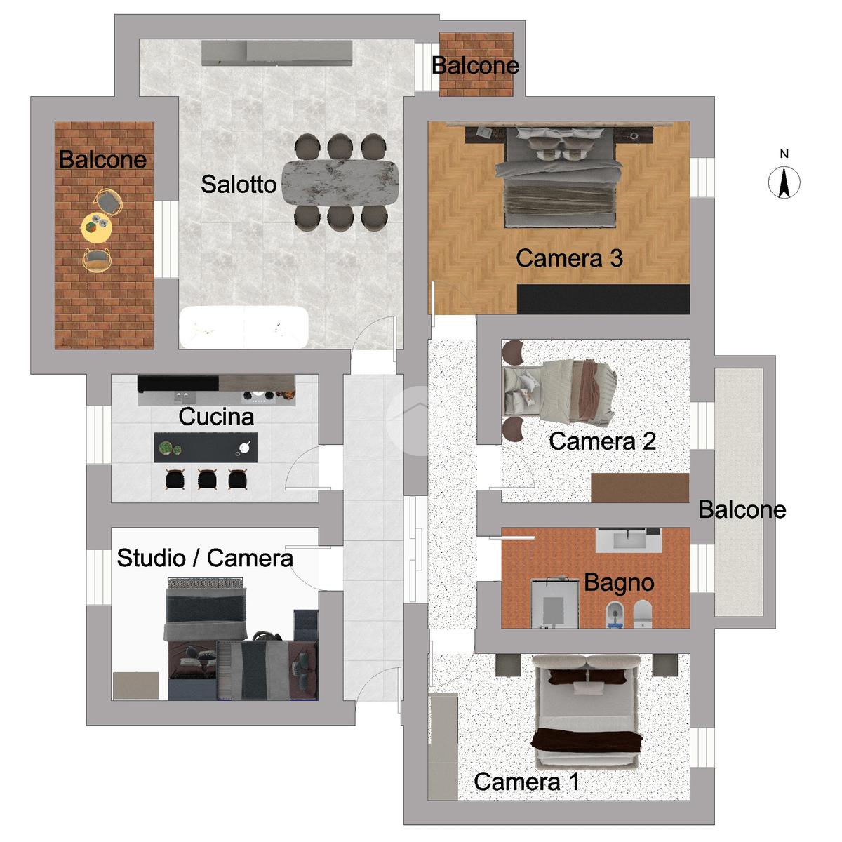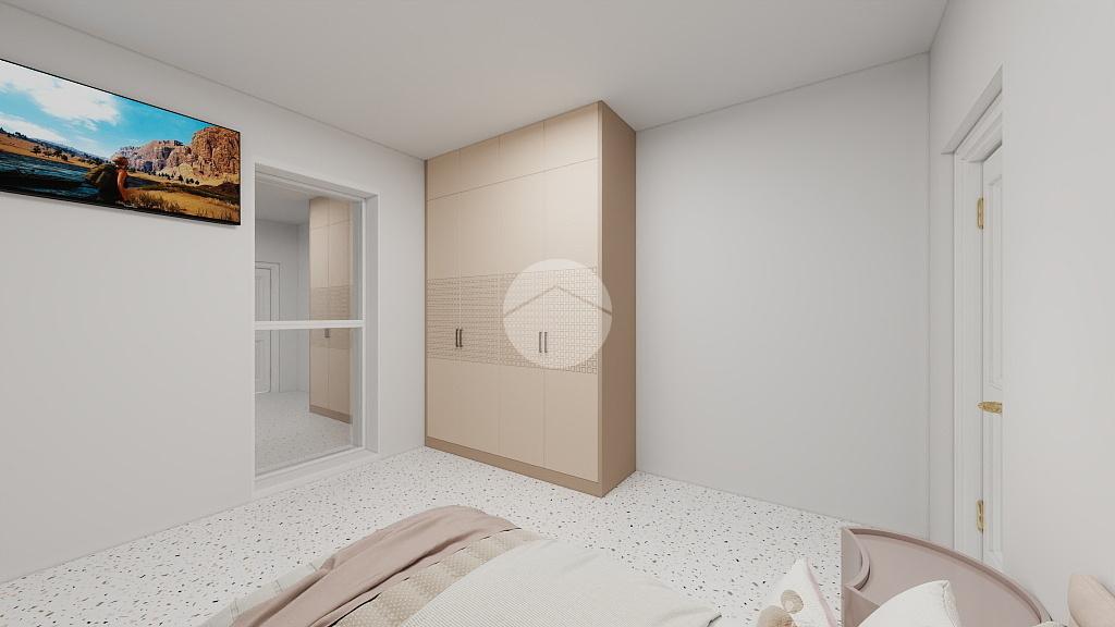 L’ingresso conduce a un’organizzazione funzionale degli ambienti, con studio e cucina da un lato e zona notte ben separata dall’altro, assicurando privacy e ordine.